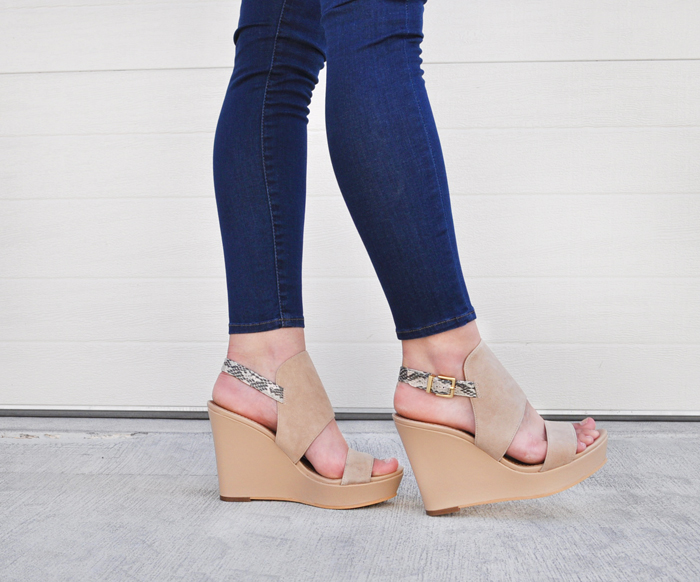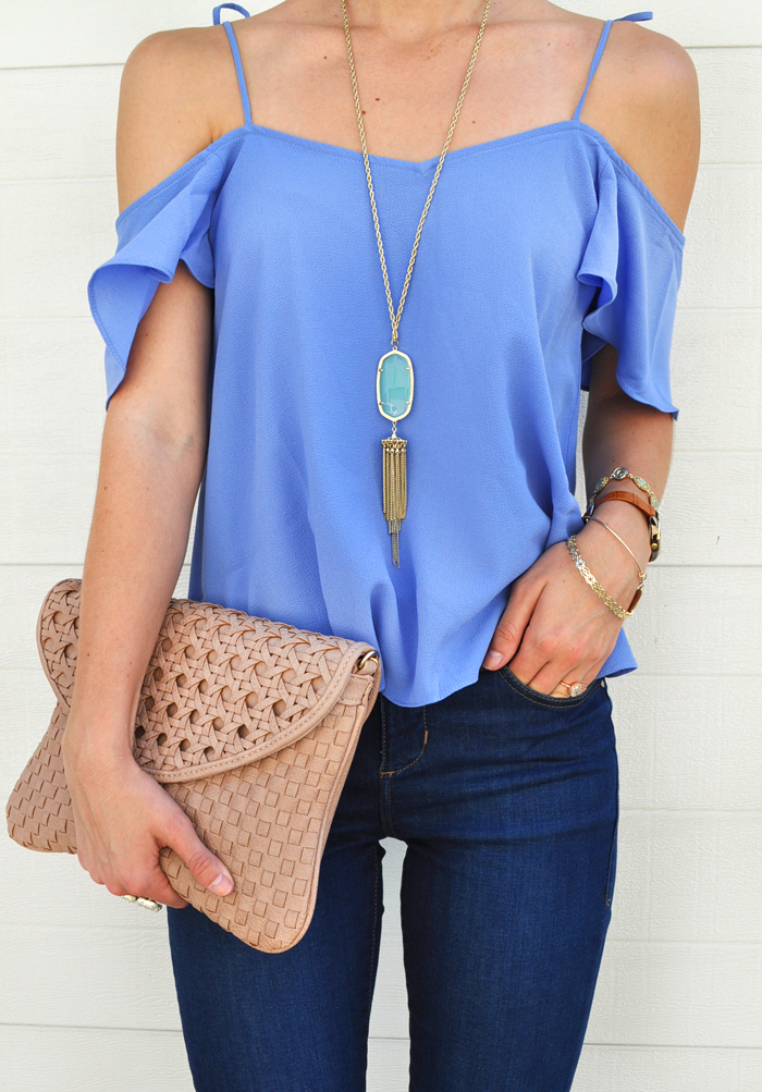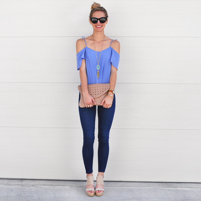 Yep…pretty sure periwinkle is my absolute favorite…isn’t it just the happiest color?! I am especially loving this off the shoulder, tie strap top in periwinkle paired with nude accessories – so classy and chic! Also, who doesn’t love dressing up blue jeans? Comfort is key, in my opinion! π