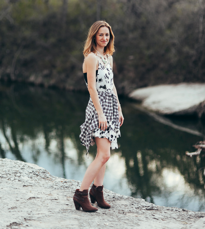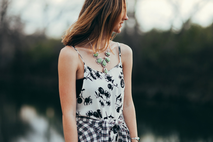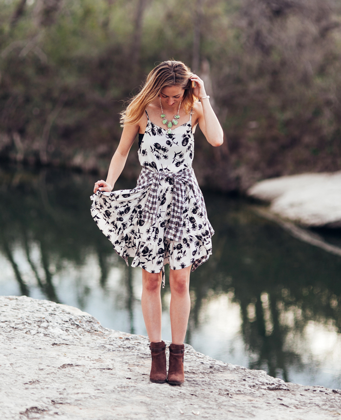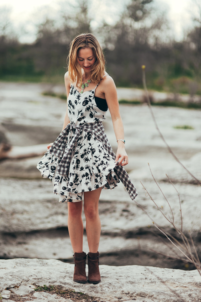 Between work, life & SXSW festivities, I managed to sneak away with the oh-so-talented Kayla Snell Photography and shoot a fun festival-inspired look featuring this amazing FP floral slip-dress (psst, you can snag this piece at the pop-up shop during the party). We’ve recently been graced with ultimate festival weather here in ATX, (sunny, breezy, bliss) so rocking a light-weight, free flowing dress is stroll-around-town, dance-all-day perfection. I paired the look with brown booties, my staple go-to, plaid flannel button down and silver jewelry (I raided my mom’s collection for this shoot, her jewelry closet is incredible! That necklace? I die!).