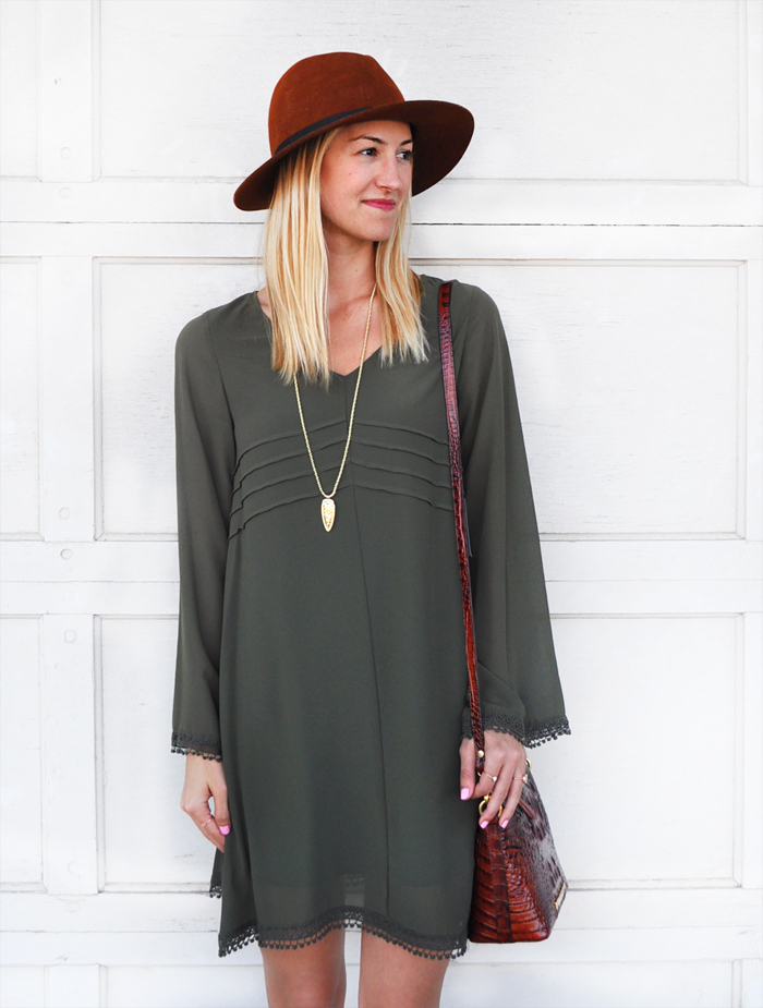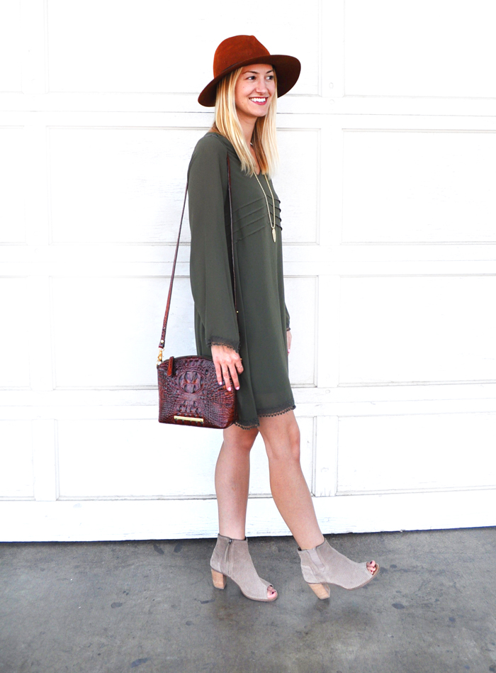 I paired the dress with my favorite open toe booties, Brahmin handbag, fedora hat and arrowhead necklace. As temps drop, just add a scarf andĀ tradeĀ theĀ peep toe heels for leggings and booties or riding boots – voila, so cute and versatile!