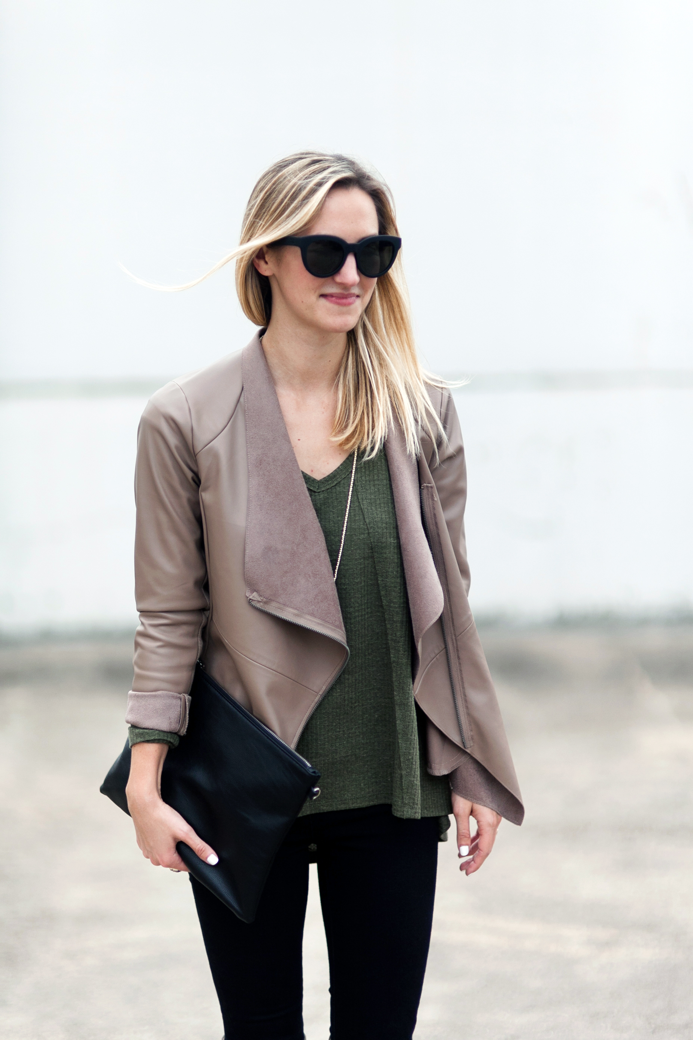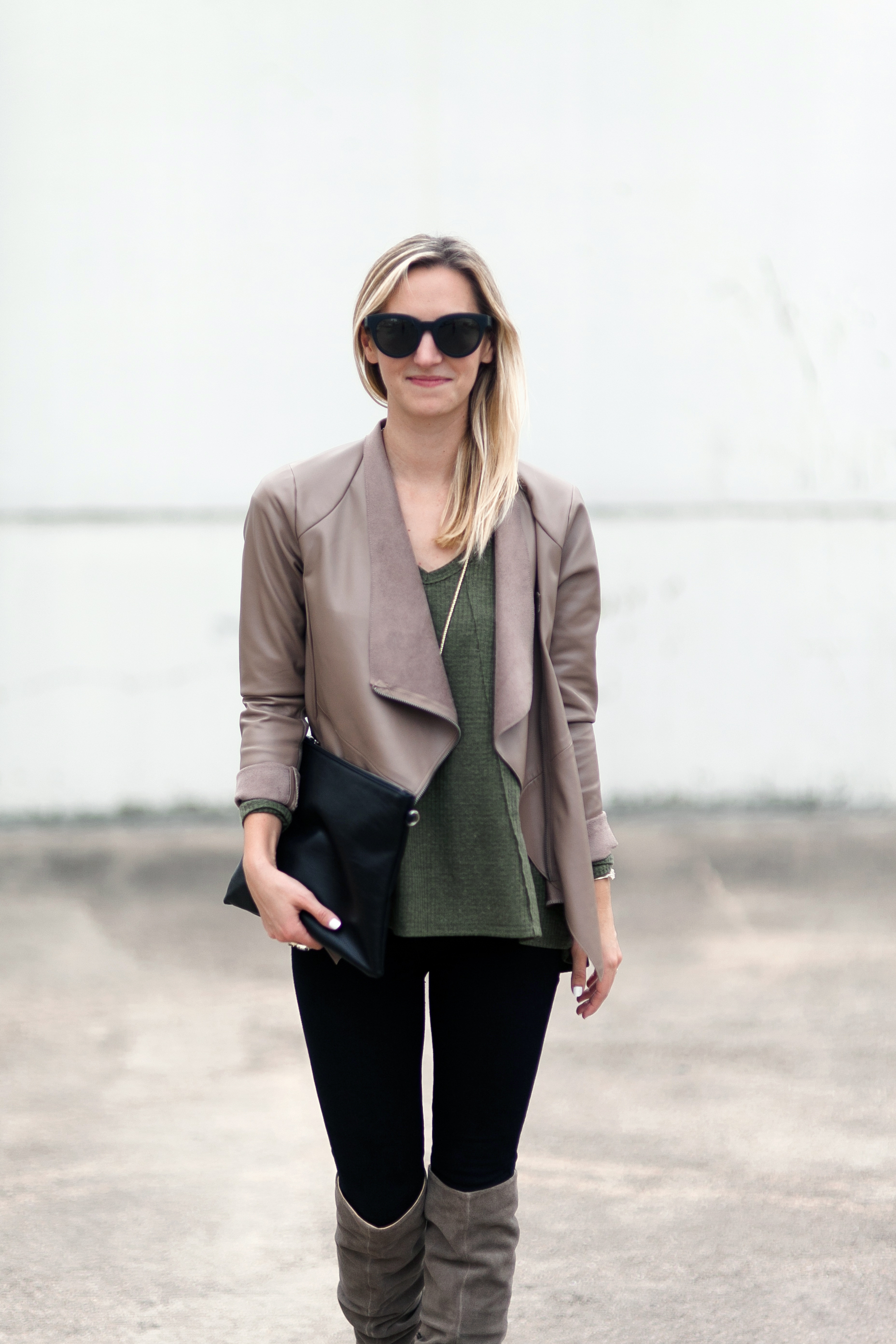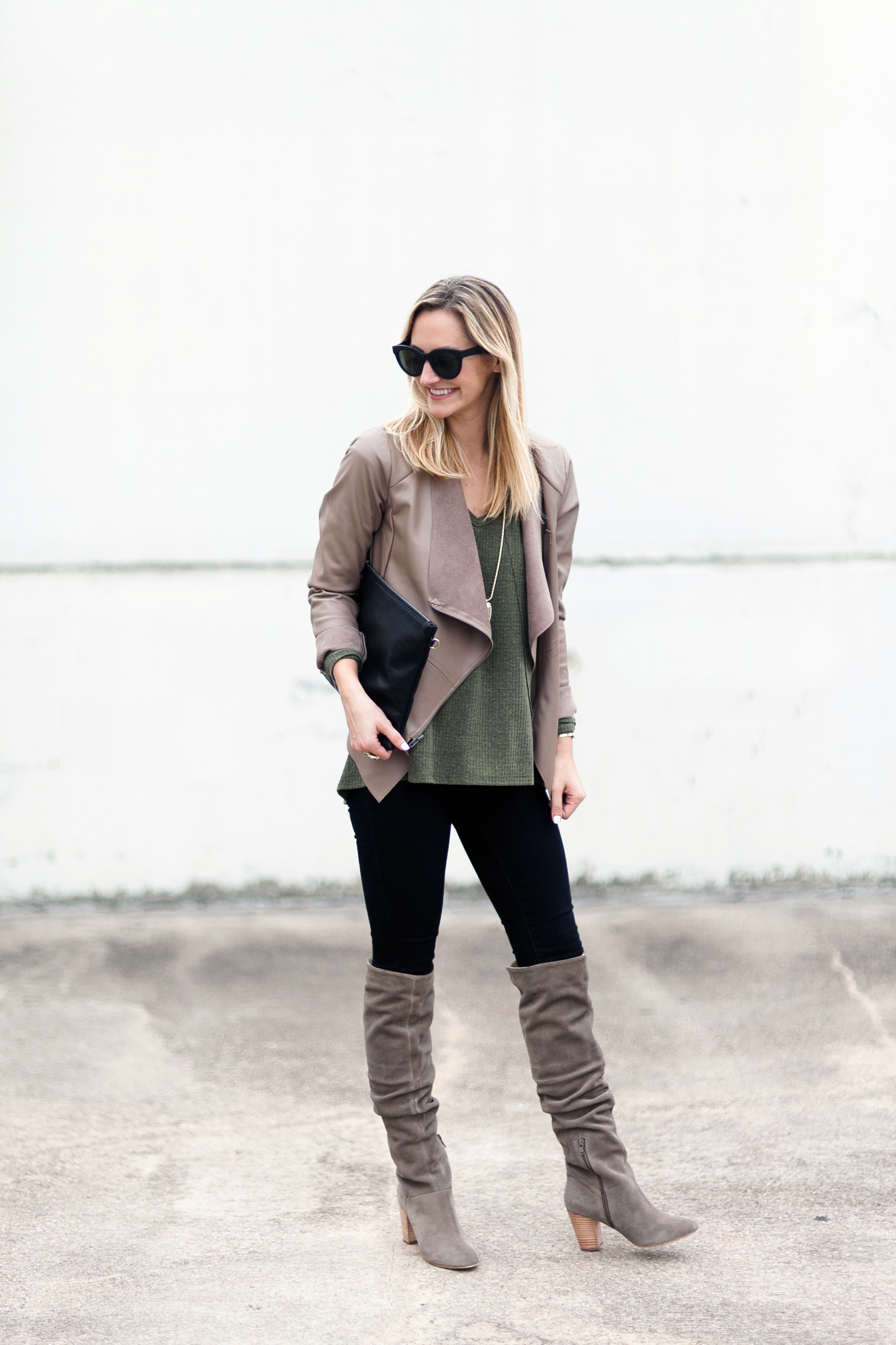 My drape front jacket is by BB Dakota and I am in LOVE wit hit. The color goes with everything and it’s such a warm, versatile jacket that really elevates any look because the cut is so fabulous. My green top under it is a super comfy, breezy long sleeve tee by Sun & Shadow – I’m loving olive green this season. Jeans are by Topshop, they’re actually high waist black skinny jeans – they go with everything, too. I loved wearing them in the summer with a crop top + wedges, and now it’s fun to style them for fall by layering up over them, they’re a great staple to have in your closet (and really affordable, too, woo!). My shoes are by Seychelles and they’re ultra comfortable and make you feel incredible wearing them! They’re sexy because of they hit over the knee, but still classy because of the color and overall shape of the shoes. They also look aaamazing with a sweater dress (sometimes flashing just a touch of leg is all you need!).