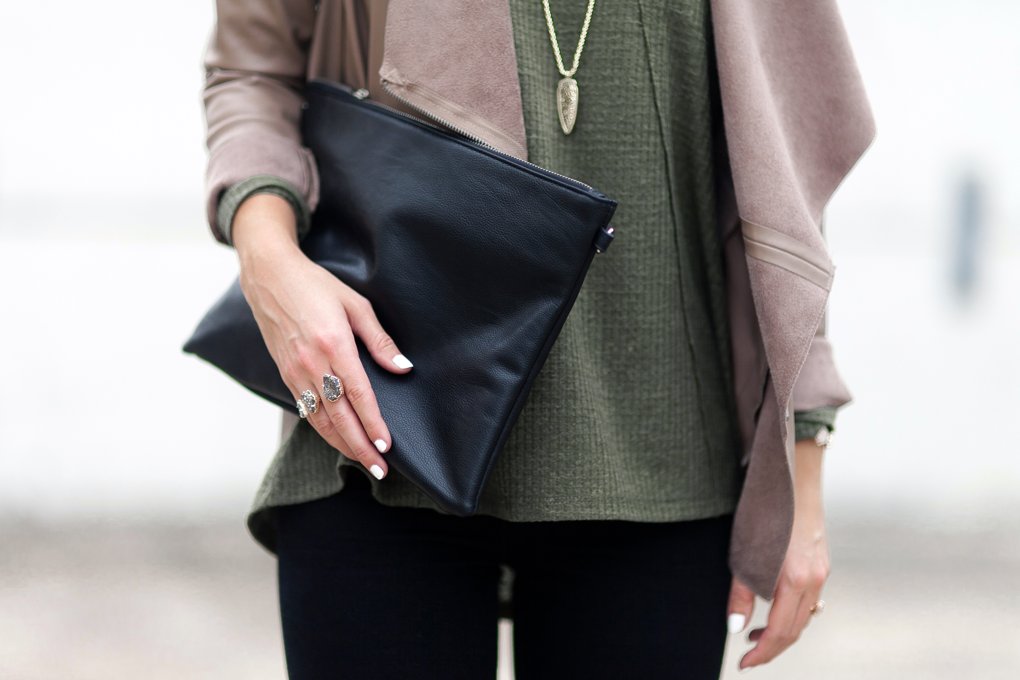 jacket – bb dakota / green top – sun & shadow / jeans – topshop / shoes – seychelles / necklace – kendra scott / ring – kendra scott / clutch – madewell