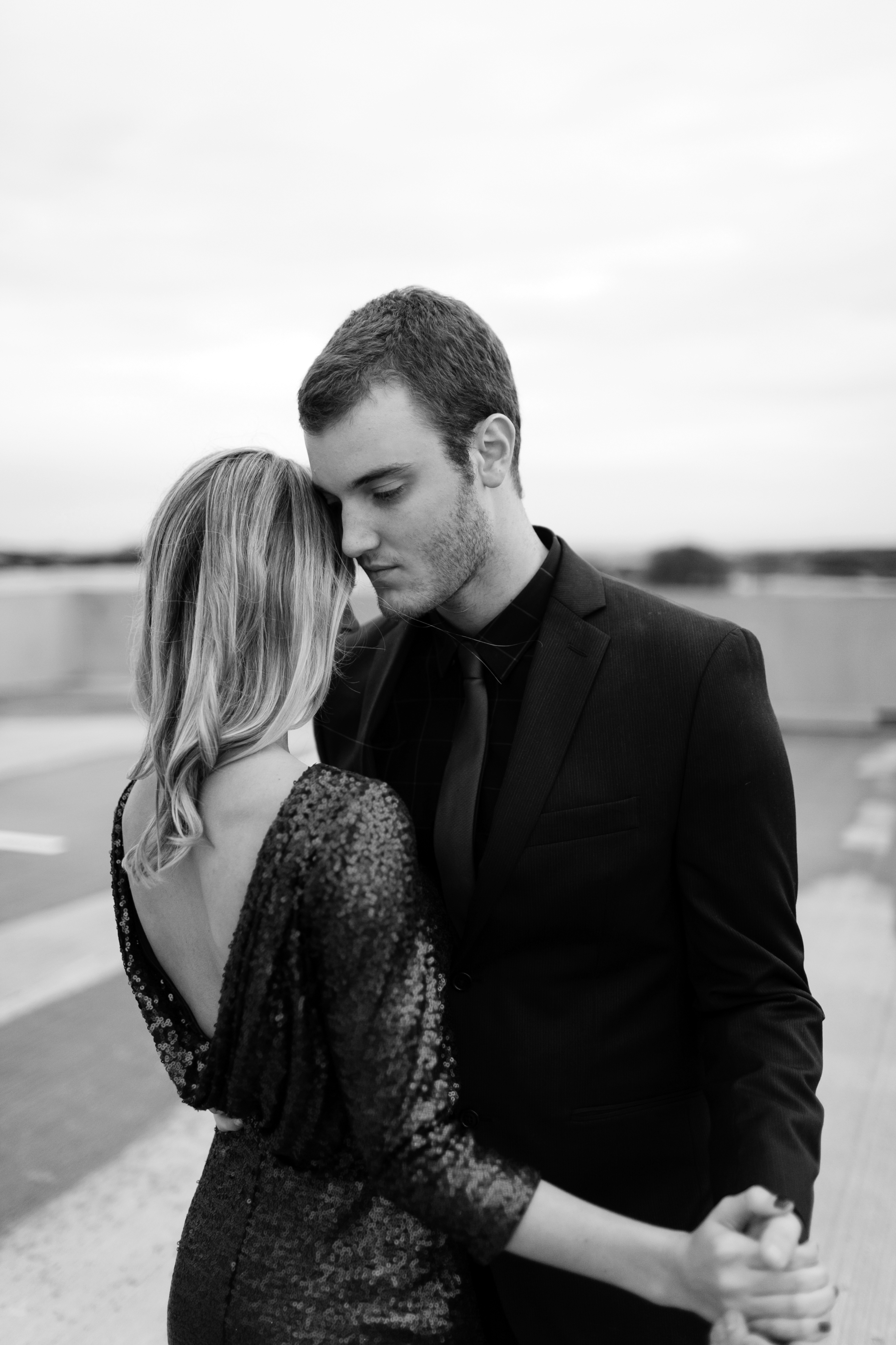 I’d been thinking up the perfect Save The Date idea for quite some time (and yes, I most definitely used Pinterest for inspo – it’s THE best!), and everything I kept gravitating towards was really simple but romantic, and left a lot of blank space at the top of the image to add “Save The Date” in a pretty scripty font. Hence, why we chose the rooftop of our first apartment’s parking garage – lots of blank white space and not a cloud in the sky, (…and more importantly, no one around to stare at us during an intimate shoot) it was perfect!