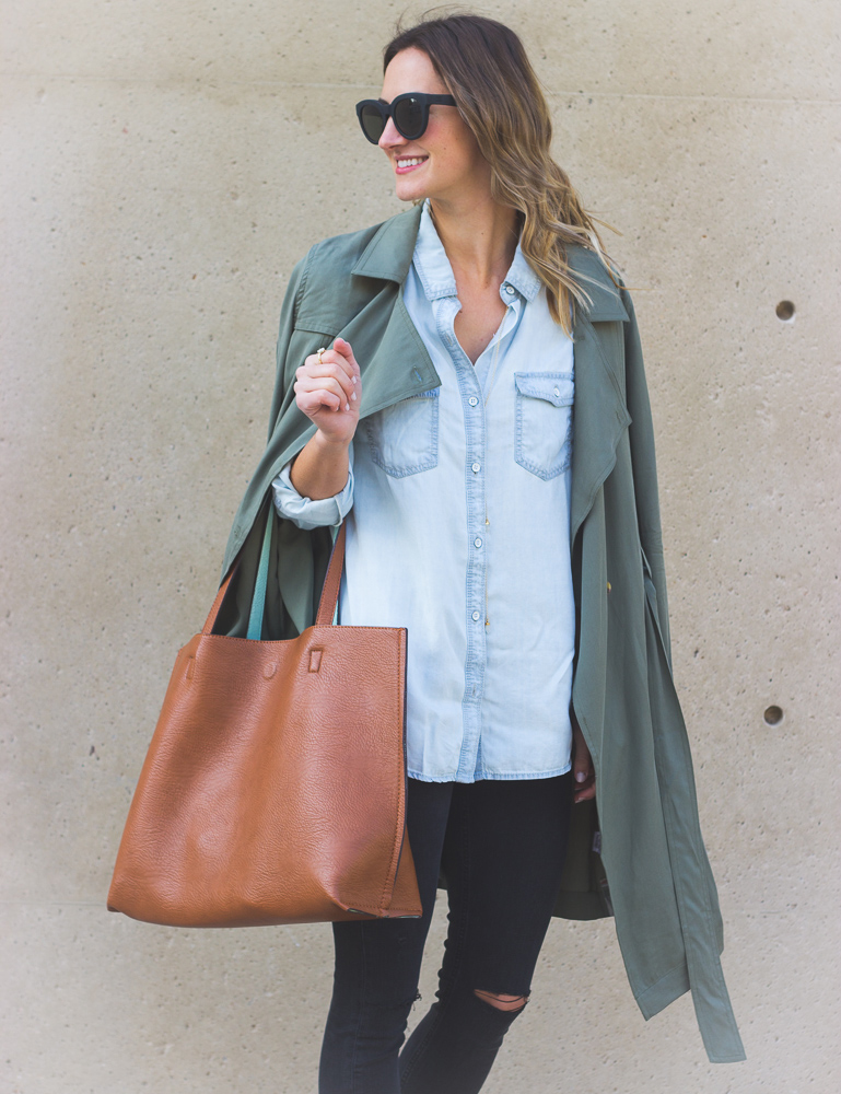 trench coat – HANGER (see similar HERE or HERE) / chambray top – HALOGEN / jeans – TOPSHOP / loafers – MADEWELL / tote bag – NORDSTROM / sunglasses – TOMS / necklace – NASHELLE
