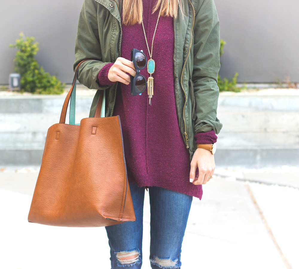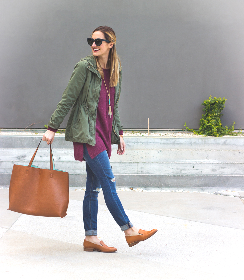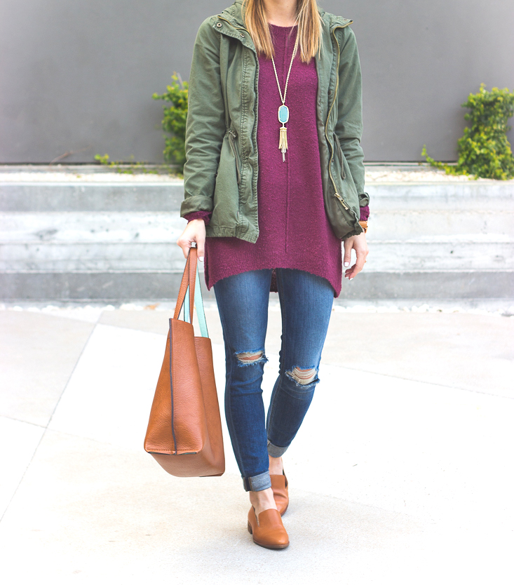 livvyland-blog-olivia-watson-joes-distressed-skinny-jeans-tan-madewell-loafer-flats-green-utility-jacket-plum-sweater-austin-texas-fashion-blogger-5livvyland-blog-olivia-watson-joes-distressed-skinny-jeans-tan-madewell-loafer-flats-green-utility-jacket-plum-sweater-austin-texas-fashion-blogger-7livvyland-blog-olivia-watson-joes-distressed-skinny-jeans-tan-madewell-loafer-flats-green-utility-jacket-plum-sweater-austin-texas-fashion-blogger-6livvyland-blog-olivia-watson-joes-distressed-skinny-jeans-tan-madewell-loafer-flats-green-utility-jacket-plum-sweater-austin-texas-fashion-blogger-4livvyland-blog-olivia-watson-joes-distressed-skinny-jeans-tan-madewell-loafer-flats-green-utility-jacket-plum-sweater-austin-texas-fashion-blogger-8The wine colored tunic I’m wearing is by BP and it’s SO cozy and the perfect length (and it comes in a ton of colors! I’m wearing a size small)…I’m obsessed with long sleeve tops that are a little oversized so that I can wear them with jeans or leggings and layer up with a cute utility jacket like this one. I paired the tunic with my Joe’s jeans which are a higher price point but SO worth it. Honestly, I’ve never felt so good wearing a pair of jeans…if you can’t tell, I wear these ALL the time (…just go to my Instagram feed and they’re aaaaall over the place, ha!).