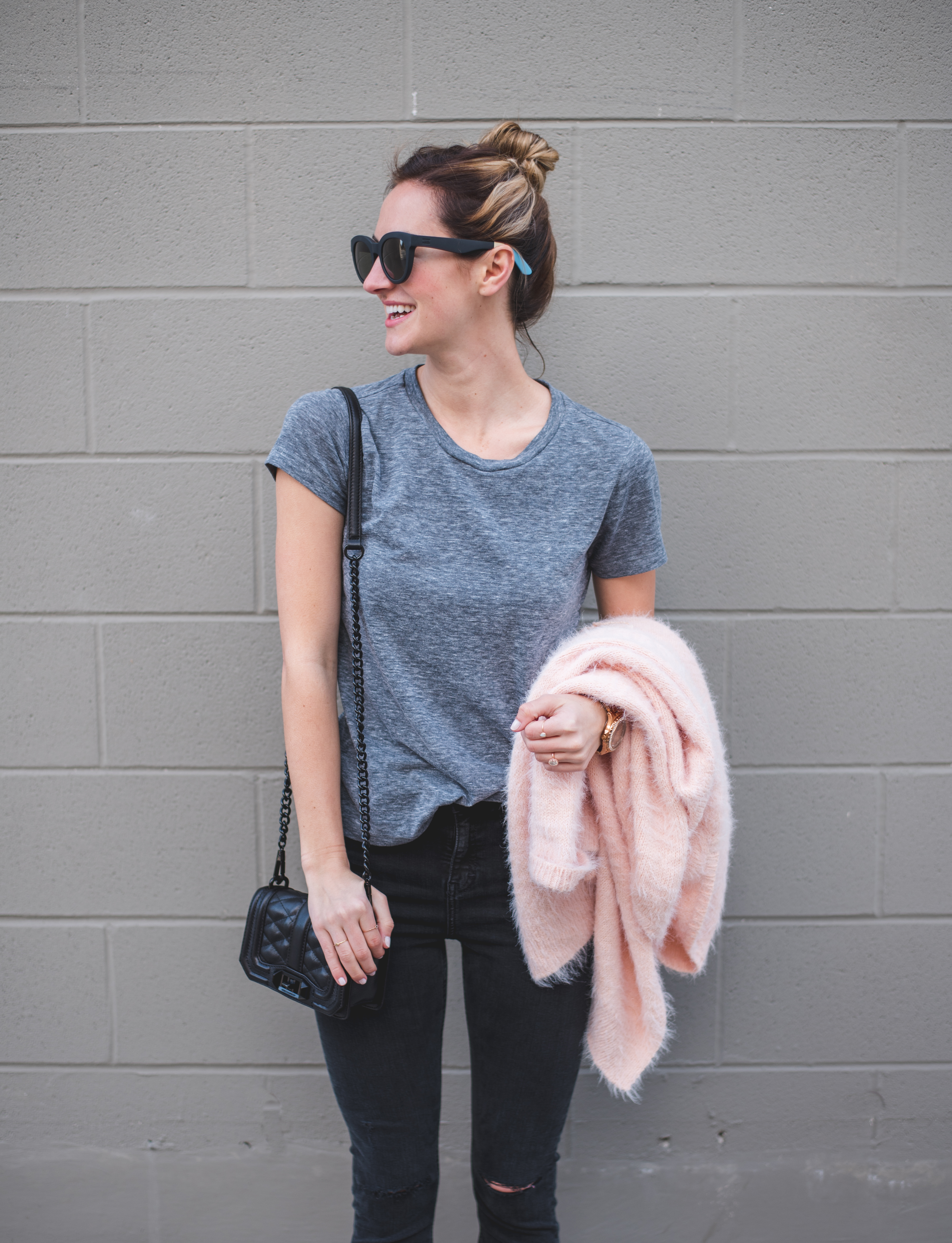 My jeans are the high waist distressed black skinnies by Topshop. Definitely order a size or two up (I ordered one size up and depending on how much I ate for lunch wish I would have ordered two sizes up haha) – but I love these things and have already worn them a TON! I paired the jeans with a basic tee shirt that is actually super old from Forever21 (I linked similar styles below) and I’m loving the coolgirl vibe of a heather grey tee shirt, so simple and easy!