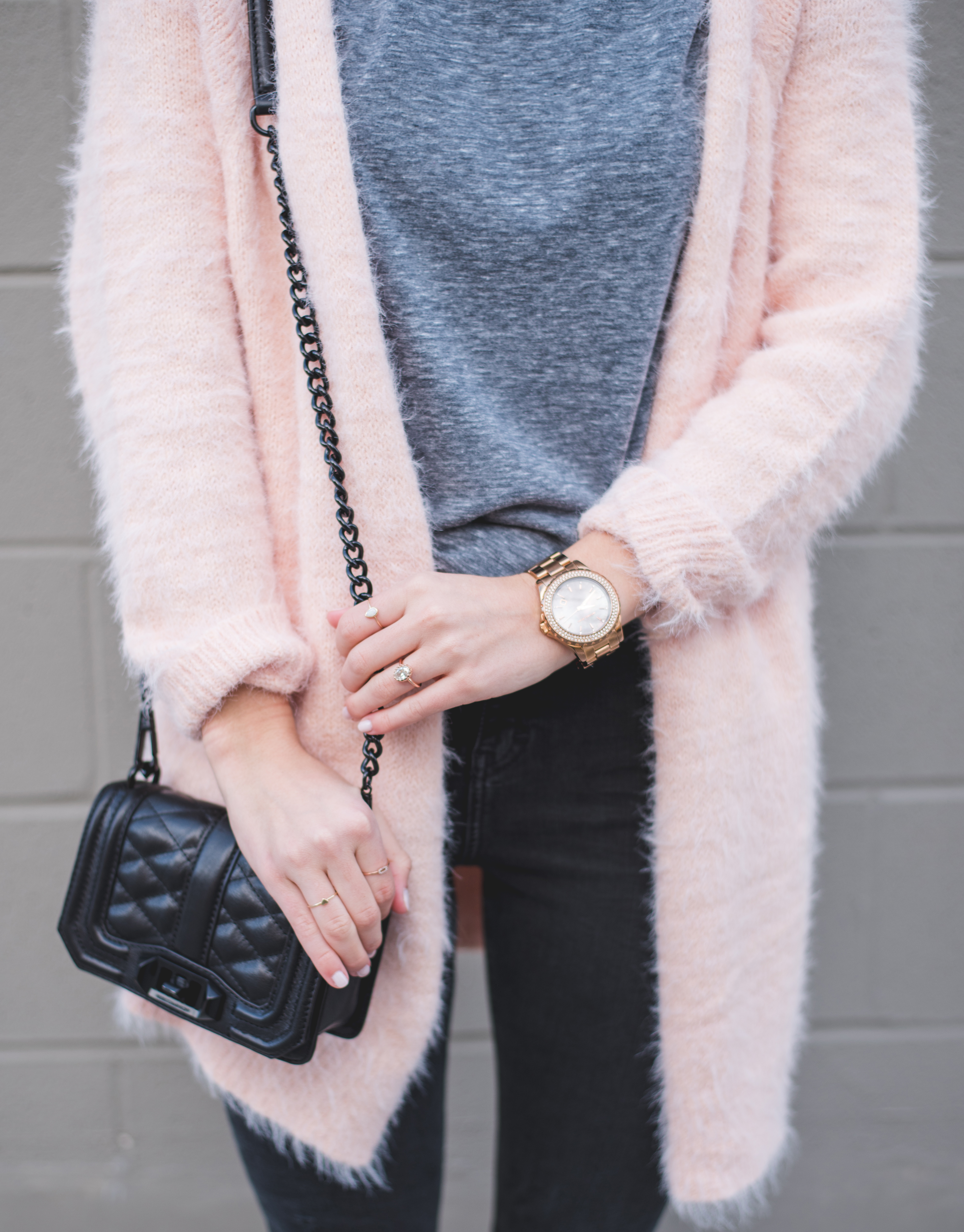 My cardigan is from Chicwish and it’s probably the best $50 you’ll spend this season. I love the length, the texture is so fun and fashion forward (crazy-out-of-this-world-soft and it doesn’t shed, woo!) and the blush pink color is so classic and feminine. Just by adding the cardigan, it makes an otherwise edgy/minimalistic look a little softer and more dynamic. Obsessed with this cardi!!