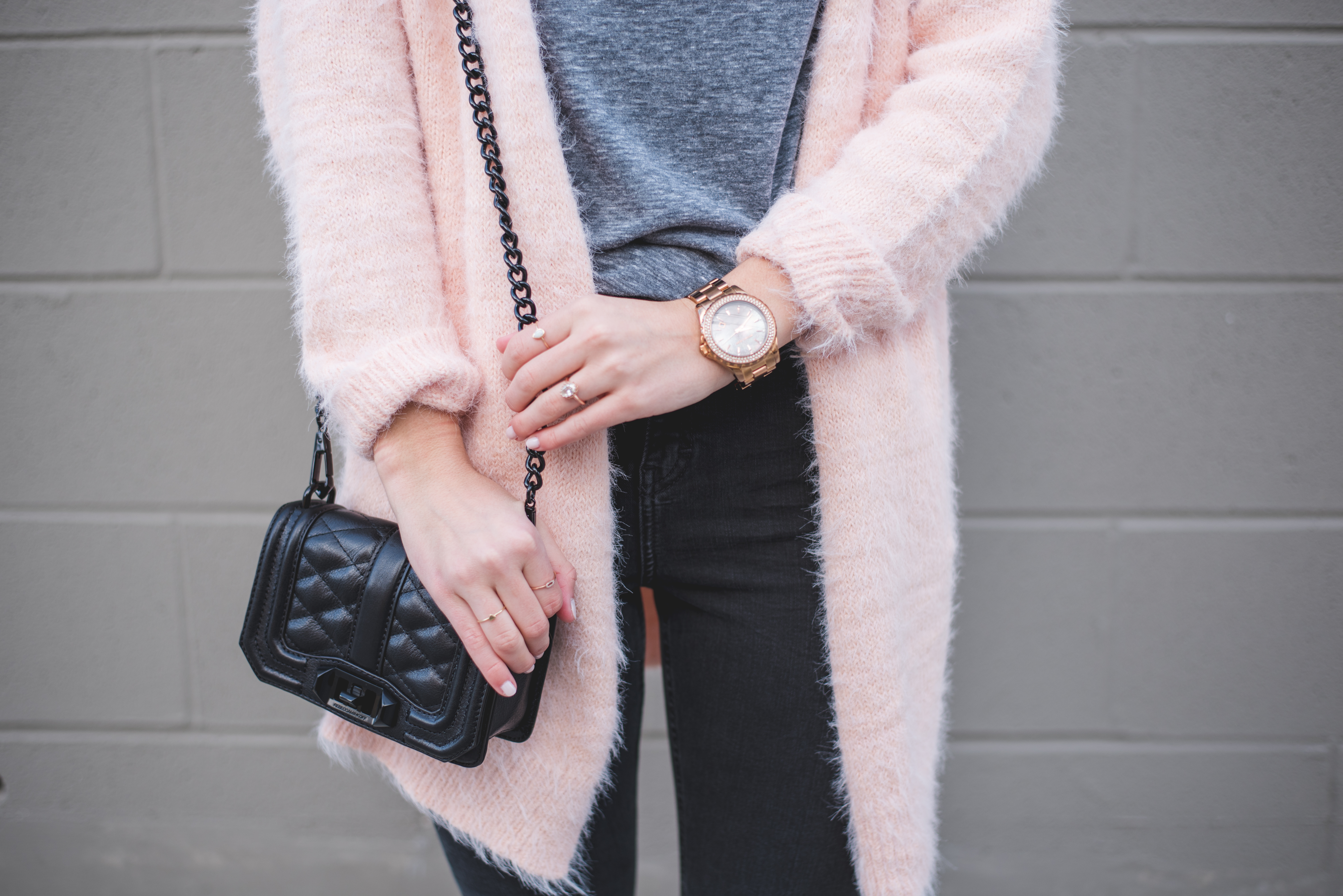 As for shoes – ohh those trendy lace up flats! I now have two pairs of these in my closet and they really just make an outfit. Super loving these lately!! Oh and did you notice that gorgeous Rebecca Minkoff handbag I’m holding? GAH it is soooo pretty I kind of melt every time I see it. I have been looking for a handbag that’s solid black with gunmetal accents, basically to have that go-to classic/edgy purse when I need it, and I really love the contrast of a more alternative handbag with the soft pink cardigan. Exactly what I was hoping to achieve! Can’t wait to style this cutie more and more, so much fun already!