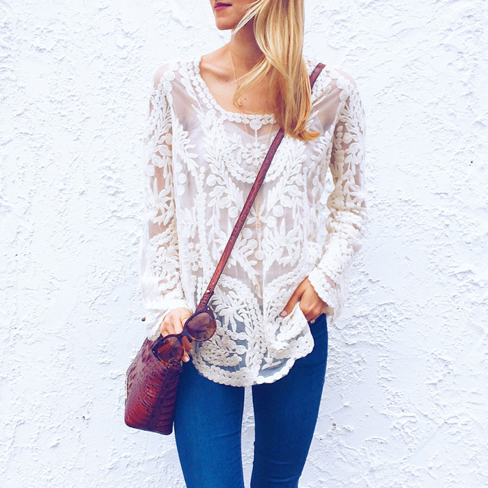 LACE TOP c.o. / JEANS (similar, mine are discontinued) / HANDBAG / SUNGLASSES