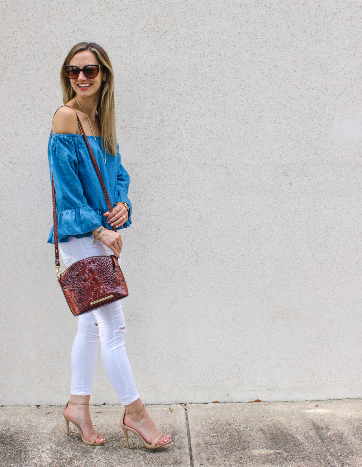 My jeans are by Topshop (order a size up – I normally wear a 25 but got a 26 in these) and I am in LOVE! You’ll be seeing these a lot more (…not that you haven’t already and I’ve only had them for about a month haha) because white is such a fabulous color for summer and the cut is super chic and flattering, I highly recommend these. My shoes are those nude strappy heels that I feel are a staple in any gals wardrobe – I get more wear out of these than any other heels I own, and they’re well under $100 (mhmm, I may just scoop up the black pair too for that price!). Lastly, my handbag is by Brahmin (yes yes, y’all know I’m a fangirl of this brand and now own a ton of their bags!) and I love the pecan color and texture, I always find their bags so classy and unique, not to mention the price point is a steal for the quality of these bags.