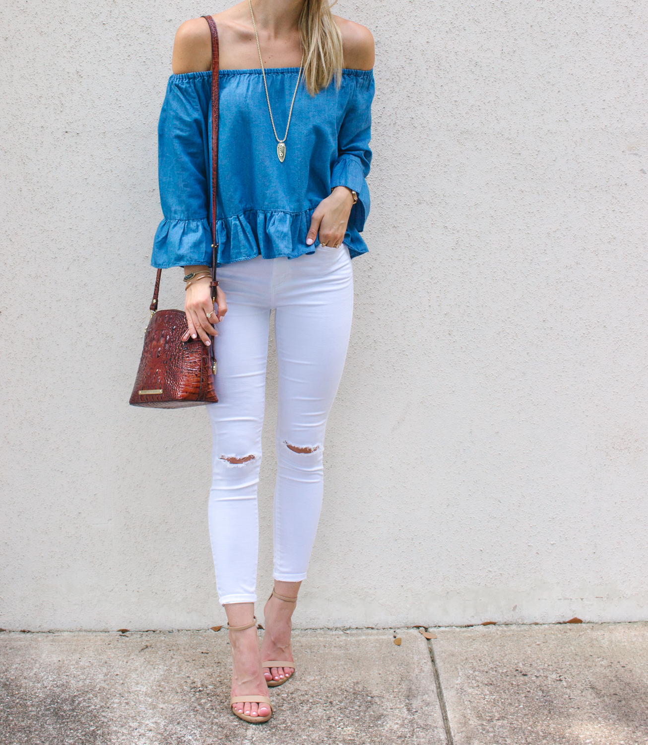 I am a big fan of Goodnight Macaroon tops/dresses/rompers – you name it, they have the cutest and most feminine options! This off shoulder chambray number caught my eye immediately and I knew it would be oh so precious for date night, a music fest, over a swimsuit…you get what I mean – lots of places to wear such a versatile top this season! I am wearing a size small for reference. 🙂 I love the girly ruffle details at the sleeves and trim of the top, it adds a perfectly flirty touch that I definitely gravitated towards!