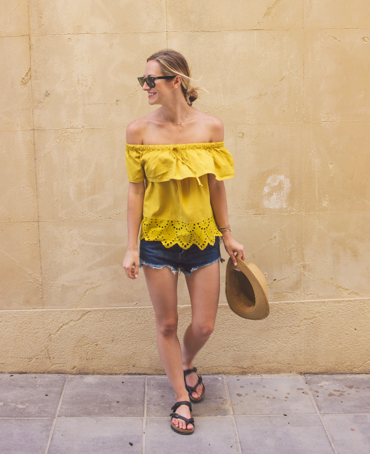 On another note, when I think of Spain, I immediately think of bright colors, sunshine and delicious food. Given the heat in Cartagena (it was a sweaty day, lemme tell ya!), I opted for a pair of cutoff shorts (totally obsessed with these, order one size up because they run small) and THE prettiest mustard yellow, eyelet, off-shoulder top! A hat was appropriate, too, since we were in direct sunlight most of the day.