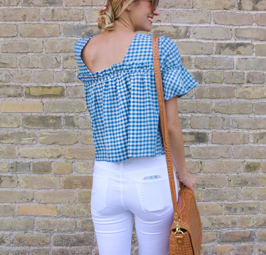 livvyland-blog-olivia-watson-goodnight-macaroon-ruffle-blue-gingham-top-white-topshop-jamie-skinny-jeans-austin-texas-fashion-blogger-3livvyland-blog-olivia-watson-goodnight-macaroon-ruffle-blue-gingham-top-white-topshop-jamie-skinny-jeans-austin-texas-fashion-blogger-4livvyland-blog-olivia-watson-goodnight-macaroon-ruffle-blue-gingham-top-white-topshop-jamie-skinny-jeans-austin-texas-fashion-blogger-6I paired the top (wearing a size small) with my go-to pair of white skinny jeans (these are by Topshop and I am obsessed! Order a full size up, they run snug), my favorite new Brahmin handbag (…that ventured aaaall over Europe and Costa Rica with me, this thing is pure perfection in handbag form!) and the cutest little braided heels by ModCloth (currently on sale for $34, wahoo!).