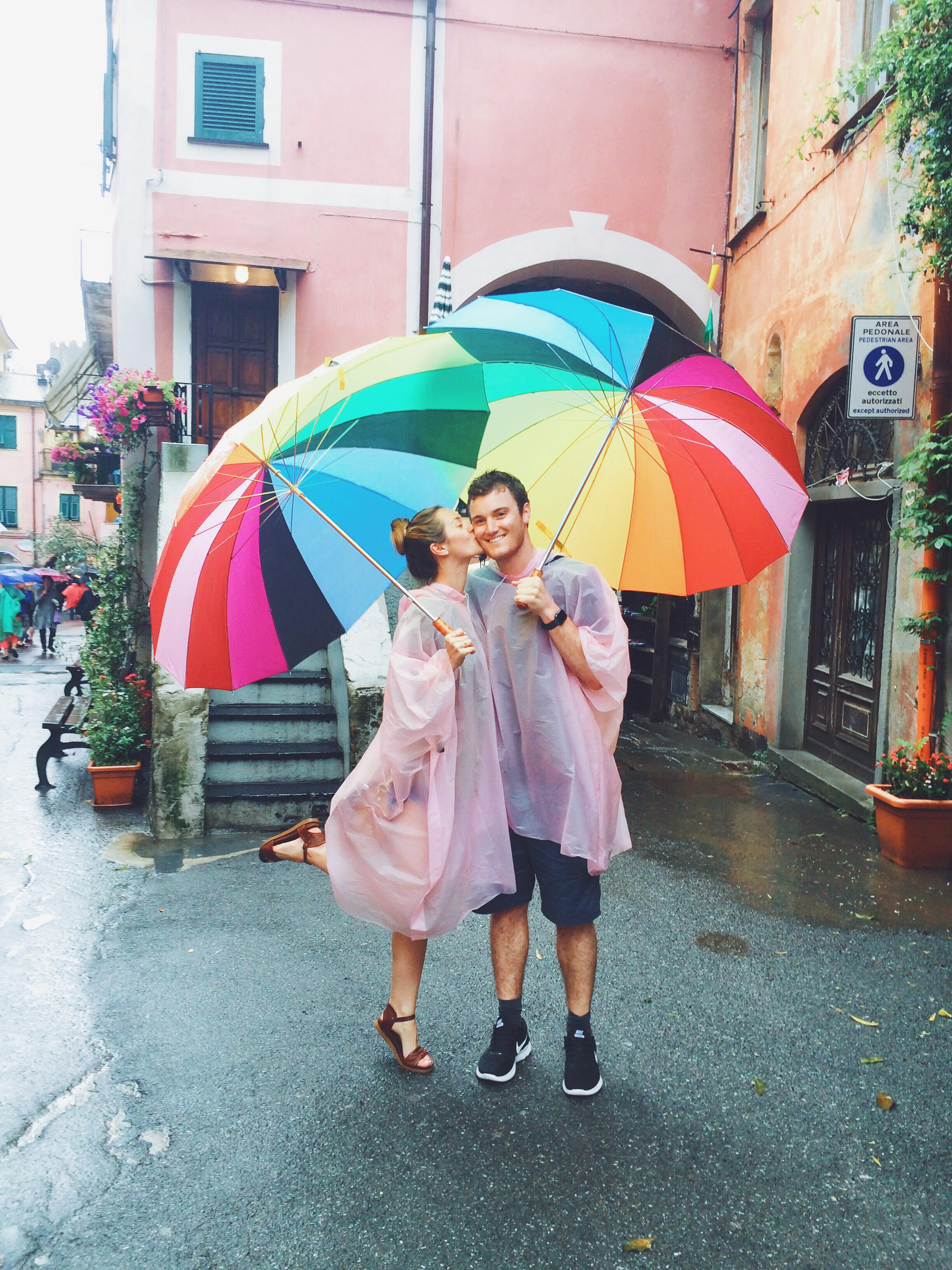 livvyland-blog-olivia-watson-austin-texas-fashion-travel-blogger-princess-royal-mediterranean-cruise-portofino-cinque-terre-italy-what-to-do-see-eat-24^^Proud to say I’m with this goof! 😉^^True love is taking a picture wearing matching pink ponchos and holding rainbow umbrellas. 🙂livvyland-blog-olivia-watson-austin-texas-fashion-travel-blogger-princess-royal-mediterranean-cruise-portofino-cinque-terre-italy-what-to-do-see-eat-26We spent a couple of hours trekking through the rain (100% soaked by the end of the day, and totally worth it!) and decided to end the excursion by drowning our sorrows in Italian wine and spaghetti…not the worst thing that could have happened, right? 😉 Though we didn’t quite snap the “Pinterest-worthy” photos we set out to that morning, this was absolutely one of the most magical days from our entire Mediterranean trip! I guess that means we’ll just have to go back to experience Cinque Terre when it’s sunny out, right? 😉