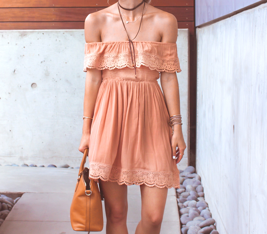 Okay, now that I’ve spilled the details on our weekend, I’m excited to finally share this pretty peachy off-shoulder dress with you! I posted this one on my Instagram last week during my stay-cation at W Austin (…can y’all time I’m reaaaaally not ready to get back to my normal routine? Literally planning “stay-cations” in my own city…if that tells you something, ha!) and it was a major hit!! It’s seriously ADORABLE and can go classic and feminine or boho (just add a choker and some platform wedges!). Ps. Shot these images in a crazy wind tunnel…note the hair…Oh well, that’s the ‘ol “au natural” bun-it-up-and-out-of-my-face look. 😉