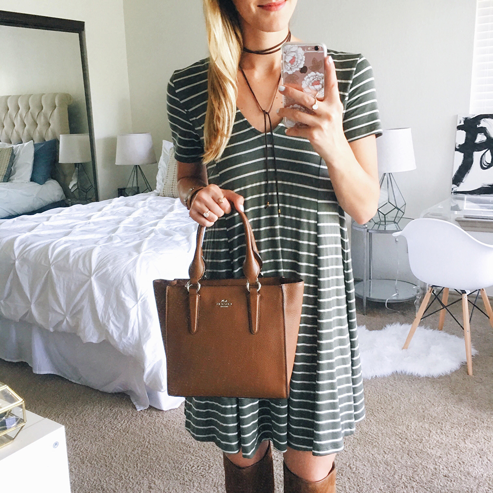 SHOP MY: NECKLACE / RING Processed with VSCO with a6 presetON SALE:  LUSH TEE-SHIRT DRESS (sale: $27, reg. $42 – wearing a size small) / VINCE CAMUTO OTK BOOTS (sale: $139, reg. $250 – they fit TTS and truly are stunning!) / COACH HANDBAG (sale: $195, reg. $295 – how gorgeous is this Coach handbag?! Gah, totally in love with the shape and color for fall!)