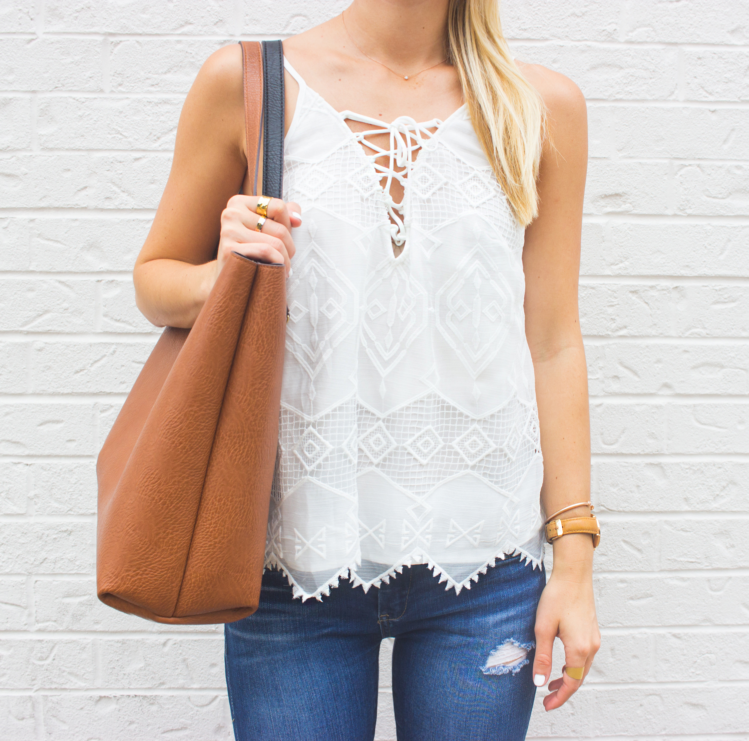 Which brings me to a the pieces that make up this adorable weekend look! Van’s sneakers (y’all, how cute are these? Just $49!!), the jeans I rarely take off by BlankNYC (they fit true to size, just $88…total steal!), the cutest textured, lace-front tank top (…seriously, this is a MUST-have for summer!!! You will not be disappointed, I always get so many compliments on it!) and of course an everyday tote bag…that’s reversible and under $50! Ba-bam, everything you see is budget friendly and fabulous. You’re welcome! 😉